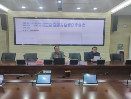 2021年11月18日星期四上午,应必赢手机登录网址的邀请,李端棻研究院院长周术槐教授到必赢手机登录网址信息楼四楼同传会议室为贵阳市事业单位人事干部能力提升培训班90余名学员及必赢手机登录网址党支部全体党员宣讲党的十九大和十九届六中全会精神。